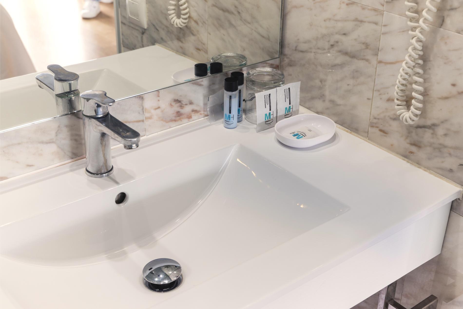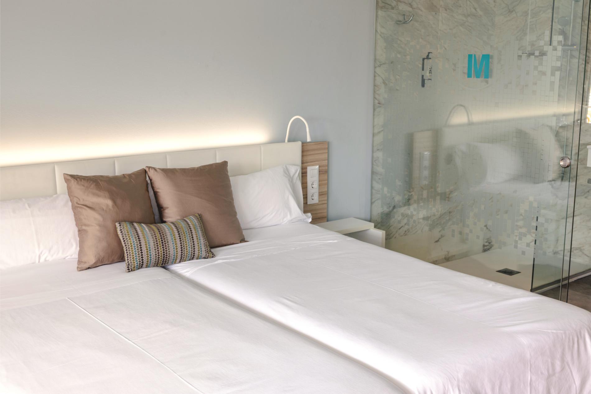 Spacious room with noble glass and marble finishes. Geometric lines that divide spaces, that separate environments. Exterior room overlooking the hotel's garden.Equipped with all the comforts.
