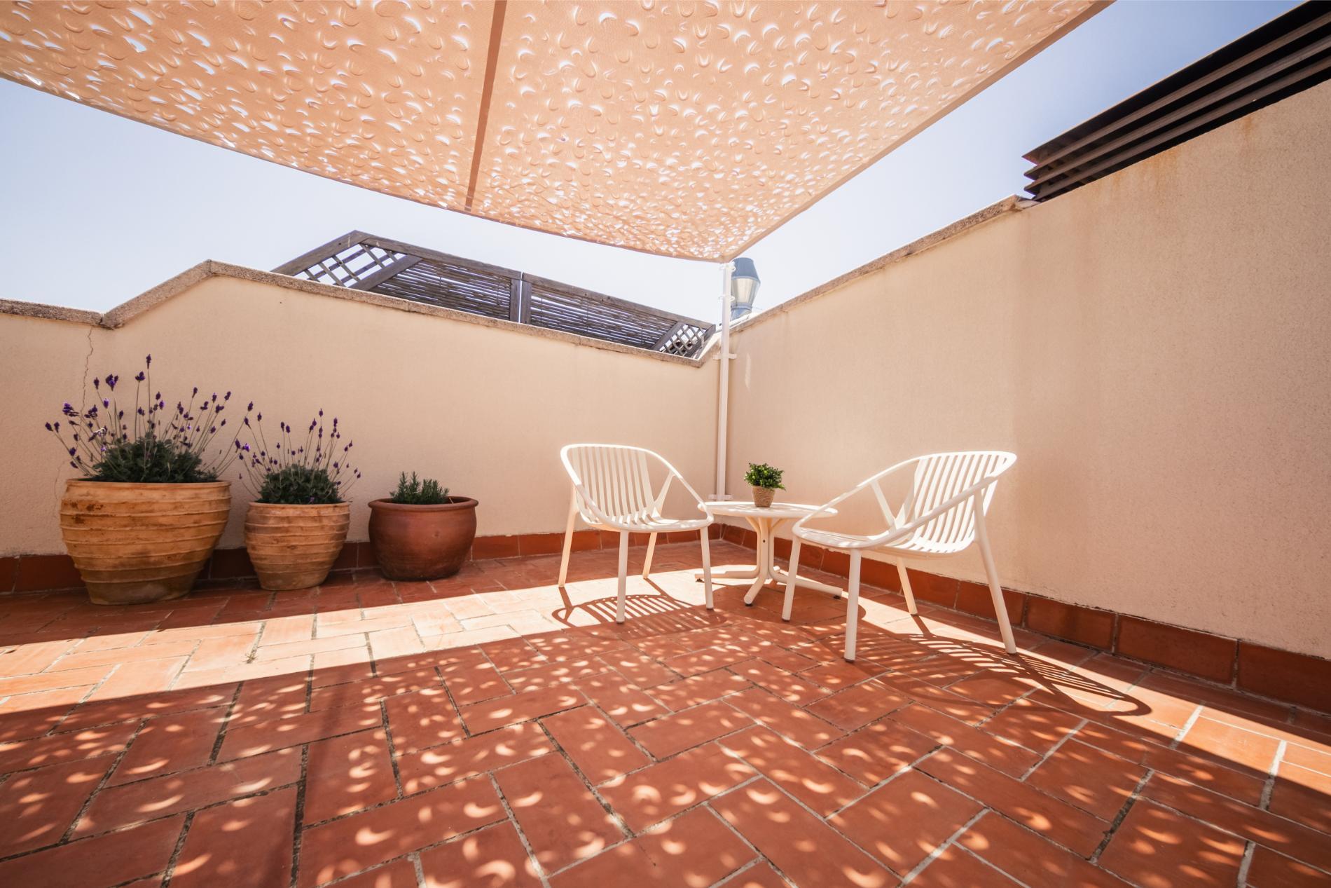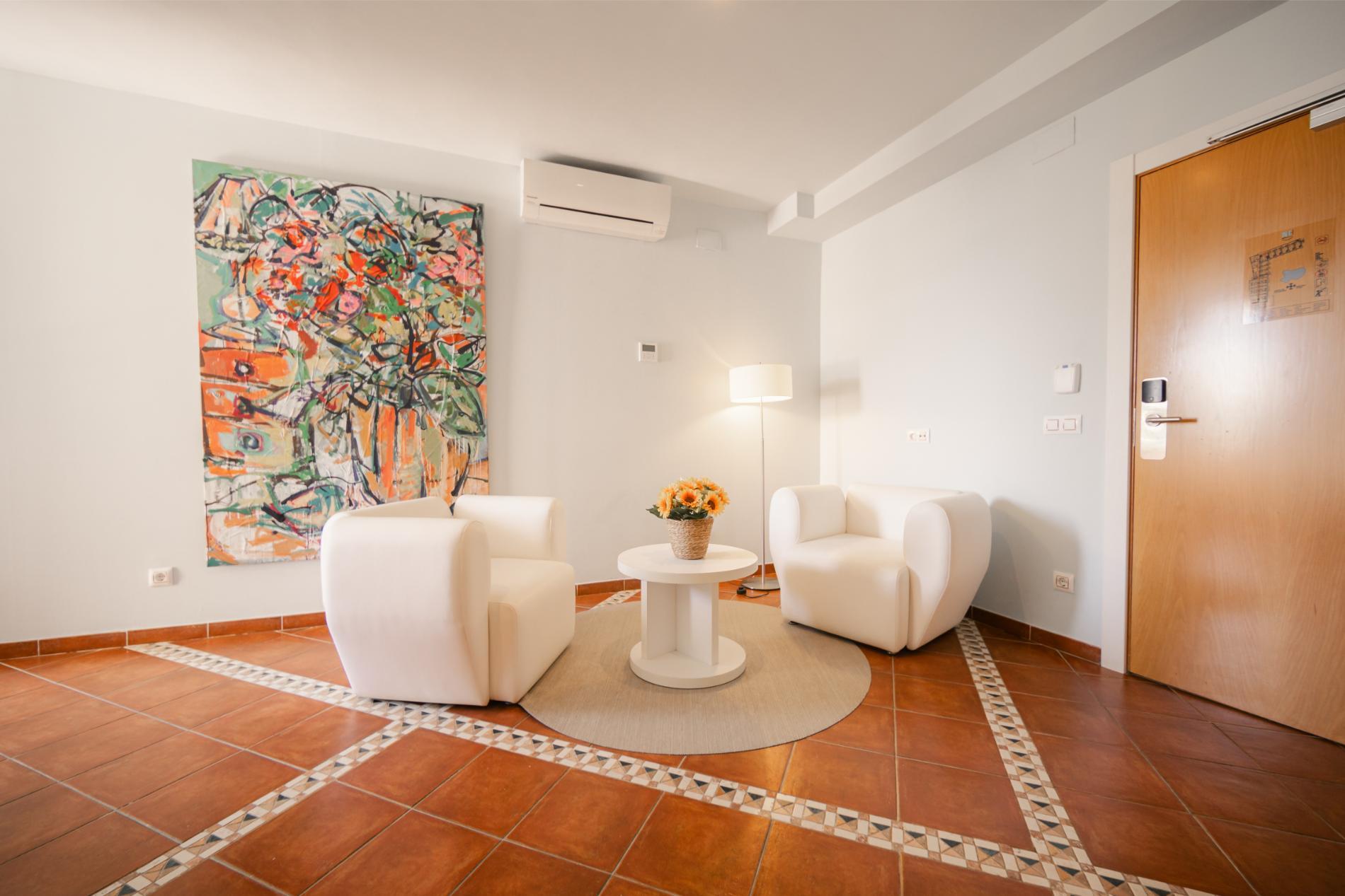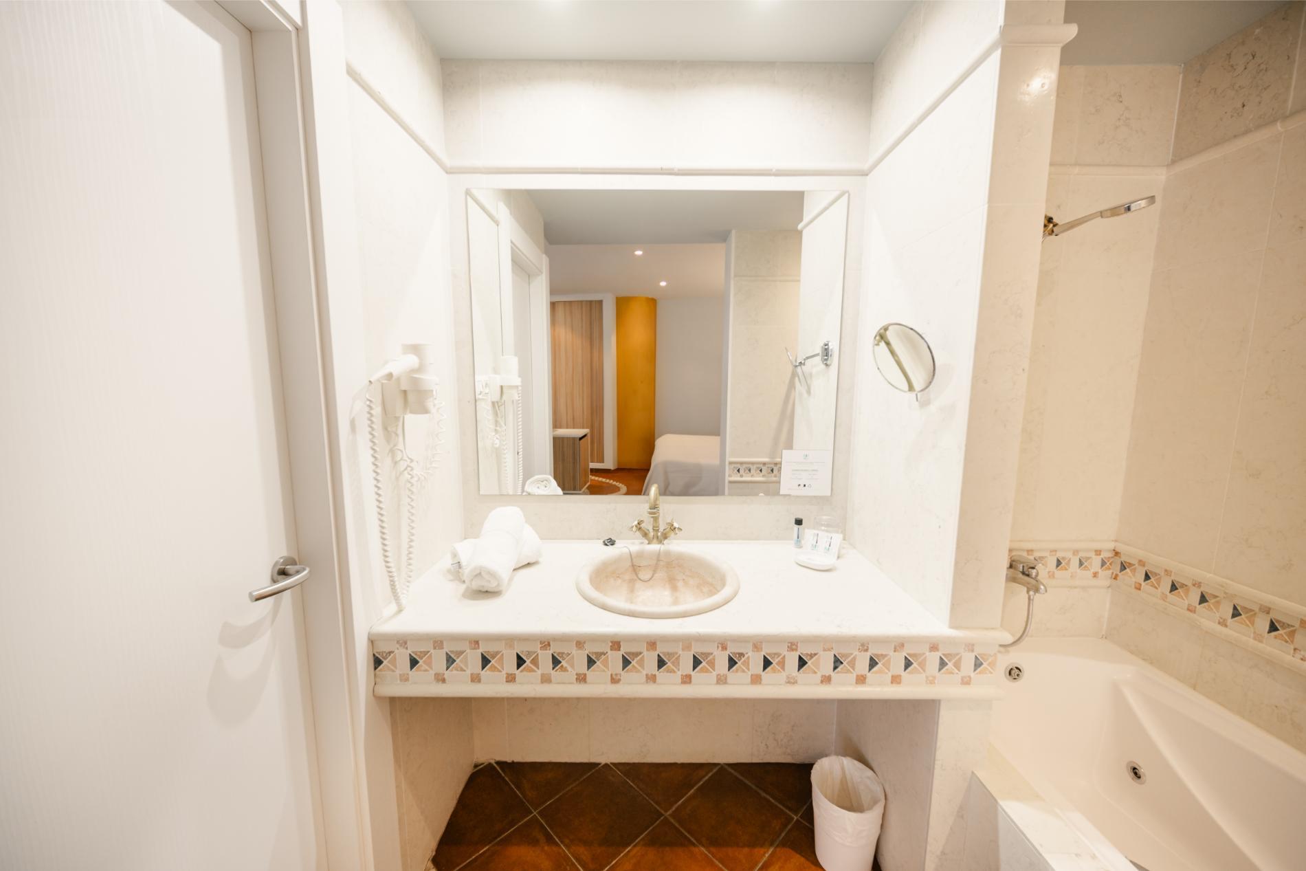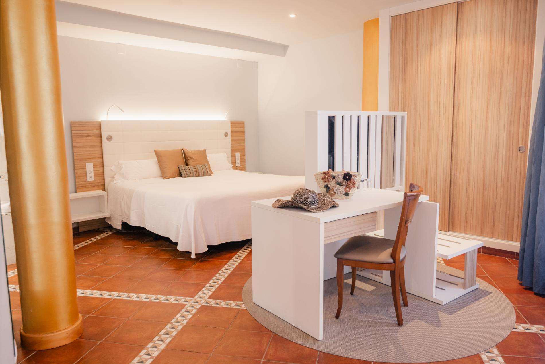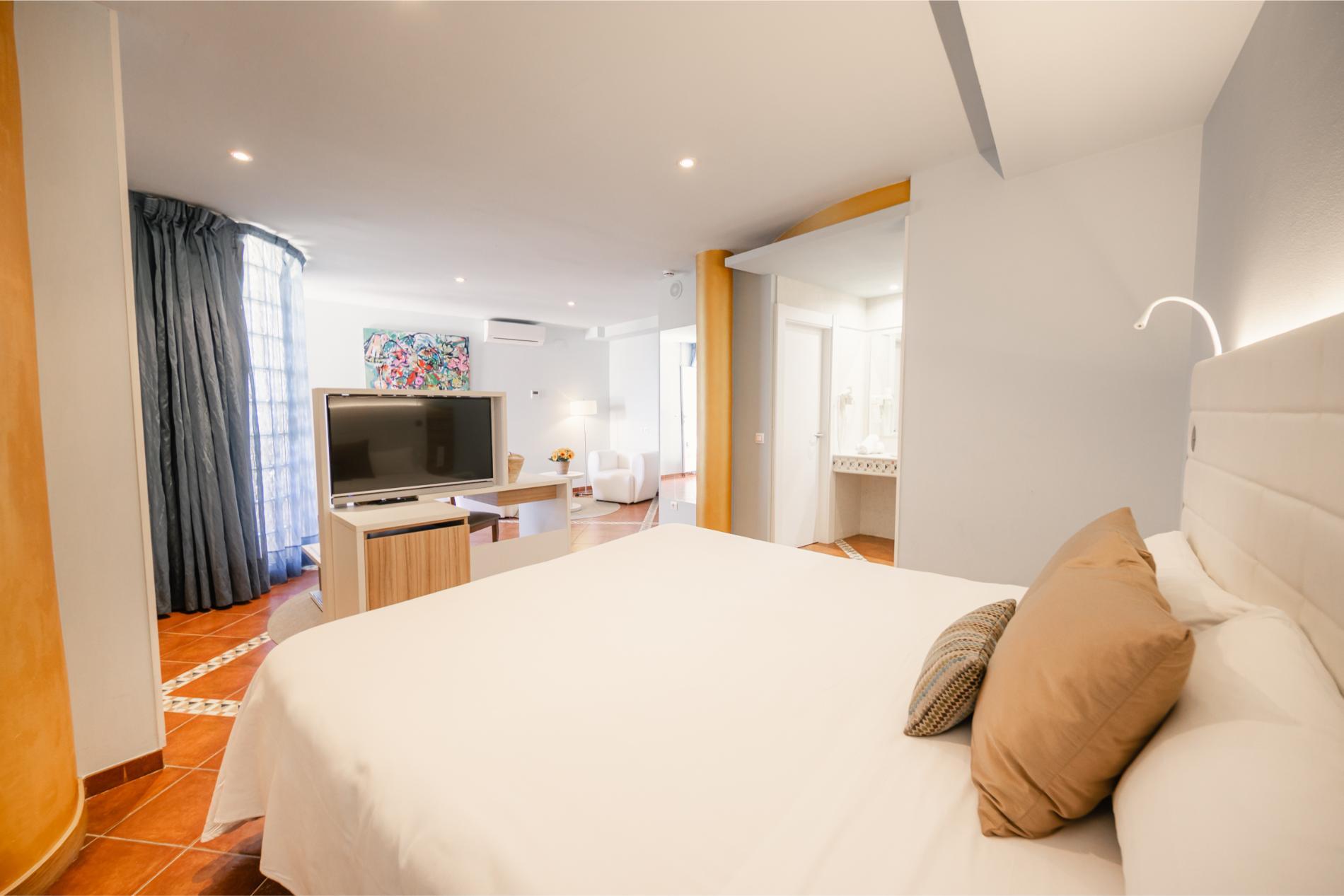 La Junior Suite es la habitación ideal para una escapada romática. Ubicada en el cuarto piso, es la habitación más grande del hotel. Encuentra nuevos estímulos, convierte cada momento en un instante memorable y vive la experiencia en tu propio compás. Habitación con balcón y terraza privada* con jacuzzi exterior. Equipada con todas las comodidades. *Acceso mediante escaleras de caracol